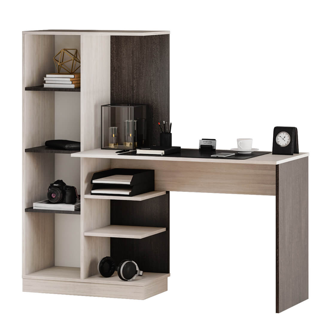Модель сочетает в себе вместительную столешницу и продуманную систему хранения: открытые полки для быстрого доступа к книгам и тетрадям, а также небольшой пенал с распашной дверцей, где можно спрятать необходимые принадлежности.