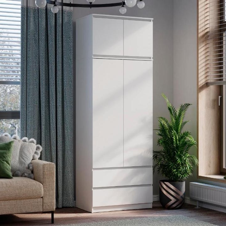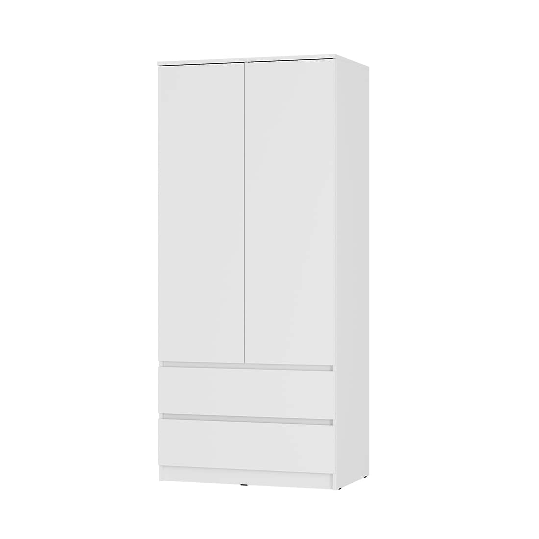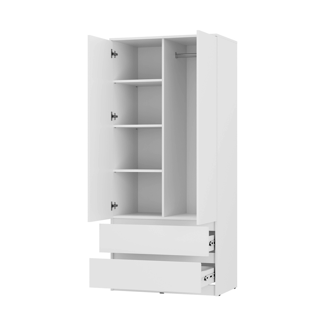 Двухстворчатый шкаф «Симпл» ШК-03 — это идеальное решение для тех, кто ценит чистоту линий и продуманное хранение. Лаконичный белый корпус с интегрированными срезами вместо ручек органично впишется как в классический, так и в самый современный интерьер. Внутри — комфорт и порядок: за распашными дверцами с отталкивателями размещена штанга для верхней одежды, а в двух вместительных выдвижных ящиках на шариковых направляющих удобно хранить обувь или белье. Надежные пластиковые опоры защищают напольное покрытие и облегчают уборку.