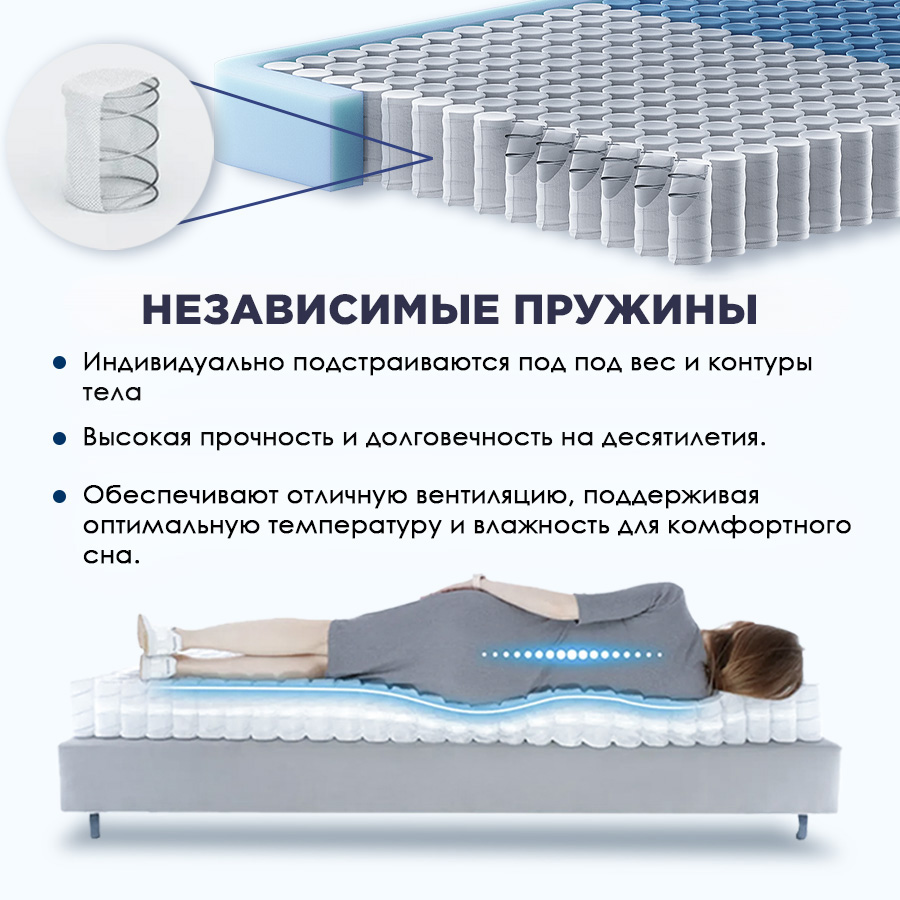 Каждая пружина работает автономно, точно распределяя нагрузку в соответствии с вашим весом и анатомией. Конструкция блока способствует постоянному воздухообмену, создавая здоровый микроклимат для сна.