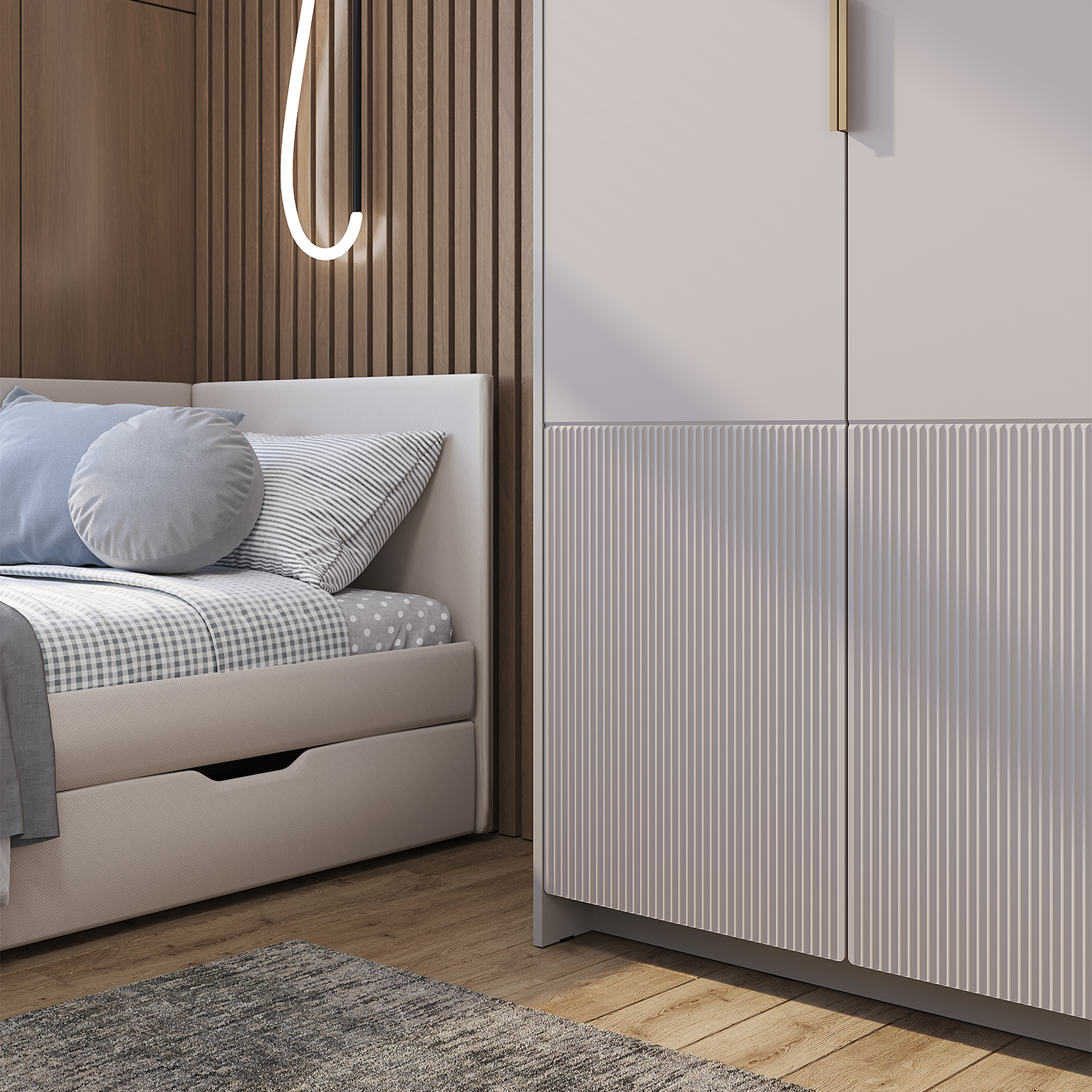 Трехстворчатый шкаф из коллекции «Пандора» создан для обладателей большого гардероба. Модель продумана до мелочей: здесь есть просторные полки для трикотажа и белья, удобный отсек для вертикального хранения и место для аксессуаров. Лаконичный дизайн в пастельных тонах («кашемир» и «айриш») подчеркнут элегантная фрезеровка и стильные ручки цвета пыльно-матового золота.
